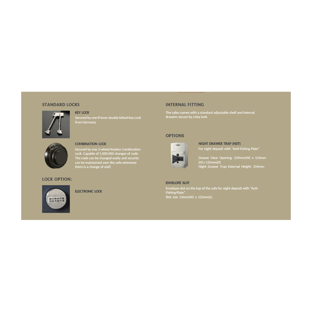 Fitted with a 3-wheel Keyless Combination Lock protected by a Glass Relocker and a 8-lever Key Lock. The key lock and relocker are further protected by drill resistant hard plates.